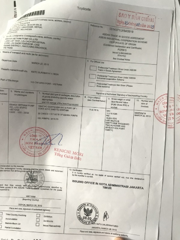 - Giấy tờ nguồn gốc xuất xứ chứng chỉ chất lượng (CO, CQ) bản sao bởi nhà nhập khẩu đóng dấu.
